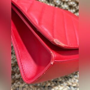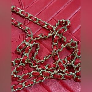 Stylish red quilted bag with elegant braided chain straps.