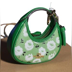 Brand new with tags, tissue paper, and a Coach shopping bag! Introducing the Coach Mini Carmen Bag Charm with Floral Print-a delightful miniature bag charm designed to resemble a handbag, showcasing an elegant green floral pattern.