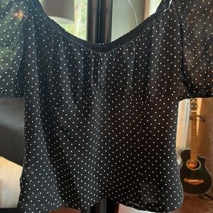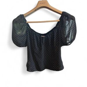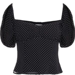 Going out top with sweetheart neckline and puff sleeves. Black viscose with white polka dots. Size 4. Made in USA