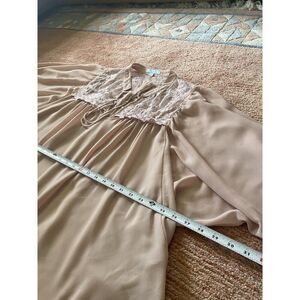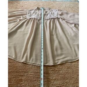 Feminine and flowy blush pink blouse by She + Sky in size Medium. Features sheer bell sleeves, gathered pleats, and an intricate lace yoke both front and back. Ties with tassels at the neck add a romantic touch. Made of a soft, lightweight fabric with a luxurious drape.