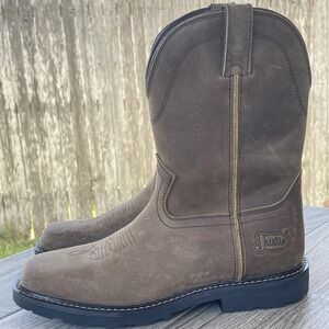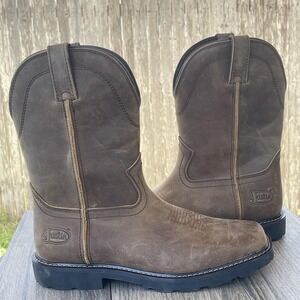 Justin Western Work Boots Men Size 8D Brown Leather Water Buffalo Safety EH SR Pull On Square Soft Toe MJ1015 NEW