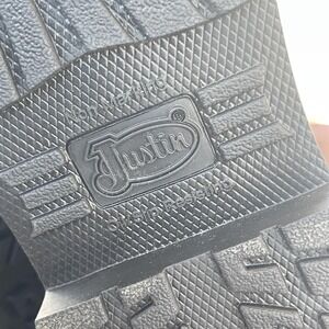 Details: Mid-calf shaft height with dual pull straps for easy entry, western-style stitched vamp, and Justin logo branding at the heel and outsole. Non-marking, slip-resisting tread pattern is designed for traction on job sites, with a square toe profile suitable for workwear and casual western looks.