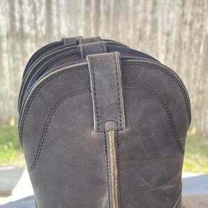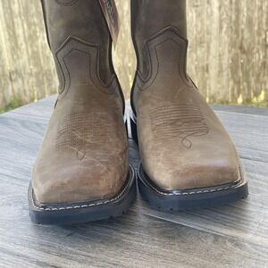 Style: Mens western work pull on boots with square toe and lugged safety outsole.
