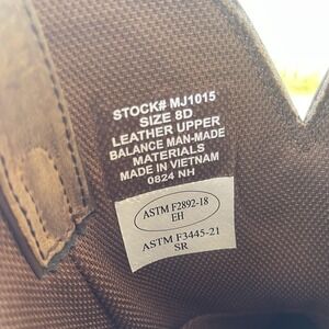 Tag information: Interior label reads STOCK# MJ1015, size 8D, leather upper, balance man-made materials, Made in Vietnam. Additional label notes ASTM F2892-18 EH and ASTM F3445-21 SR safety standards.