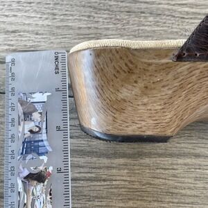 Color: Dark brown leather upper with beige footbed and light woodgrain-look wedge midsole.
