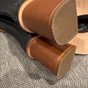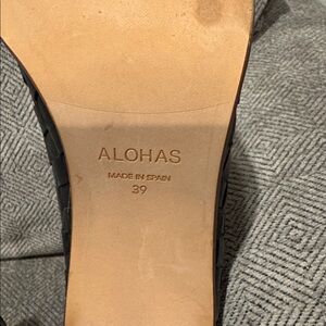 Alohas Women’s Braid Ankle Chic black woven design. Stylish block heel. Perfect for versatile wear, upper cowhide, zip back closure, square toe, leather sole with rubber heel cap, heel size 7.5cm, size 39 us 8-8-5, pre owned had marked on the sole when I removed the plastic liner, scuffs on the heel, they have some wear not much look at pictures if you need more. I wear an 8 a little big for me. Perfect all year around, no dust bag nor box, made in Spain
