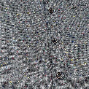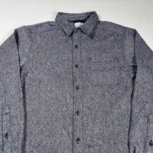 Columbia button down. Heavyweight Polyester/wool blend shirt. Base color is a grey blue with speckled colors throughout. Like new condition, no flaws.