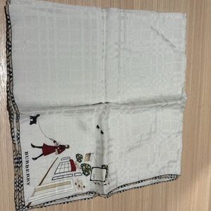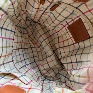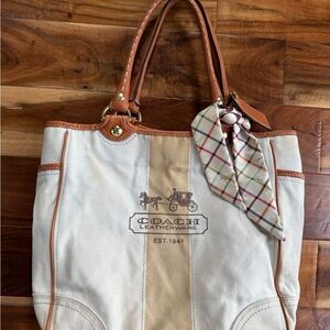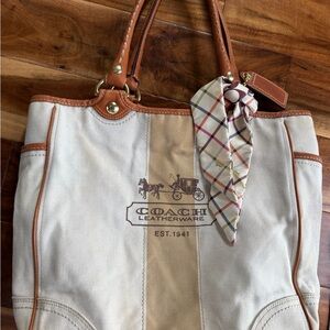 Elegant Coach tote with cream canvas and tan leather accents. Includes a plaid scarf detail.needs some cleaning.
