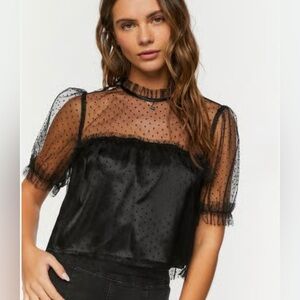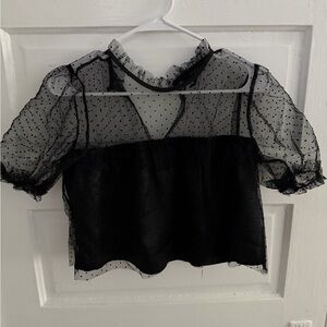 Sheer polka dot blouse, worn once, slightly high neck, hits at the hips