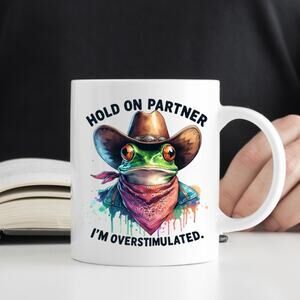 Get ready to brighten your day with this absolutely delightful "hold on partner, i'm overstimulated!" 15 oz Coffee Mug! It's an incredibly funny and cute piece that's sure to bring a smile to anyone's face, making it a truly perfect gift. Imagine starting your morning with a chuckle as you sip your favorite brew from this charming white mug. Its unique design features a hilariously overstimulated frog cowboy, ready to add a touch of whimsy to your kitchen or office space. We know convenience is key, which is why this fantastic mug is both microwave and dishwasher safe, ensuring easy heating and effortless cleaning. Plus, each mug is made to order, guaranteeing you receive a fresh, high-quality item crafted just for you. Whether you're treating yourself or looking for a memorable present for a friend, family member, or colleague who loves quirky, funny, and cute items, this 15 oz mug is an excellent choice. It's ideal for coffee, tea, hot chocolate, or any beverage you desire. Don't miss out on adding this charming and humorous piece to your collection!