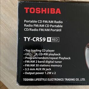 Compact and stylish Toshiba boombox. Features CD player and FM/AM radio. Ideal for portable music enjoyment.