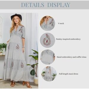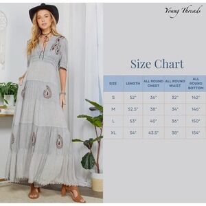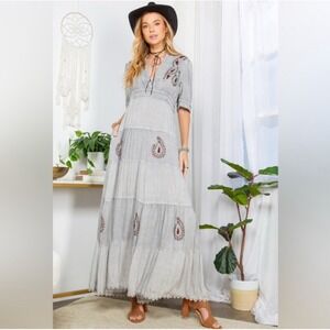 Young Threads Gray Maxi Short Sleeve Maxi Dress Embroidered Boho Cowgirl