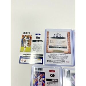 This lot comprises seven rare trading cards featuring some of the most promising college football stars. These cards are exclusively designed by Panini and come with a range of unique features, including serial numbers, holograms, and limited editions. The cards are made of high-quality cardstock and come in the standard size for trading cards.