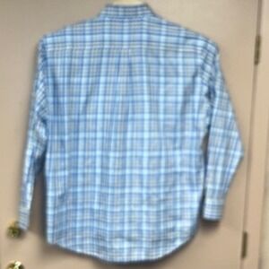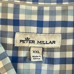 Peter Millar long sleeve button down shirt in a classic blue and white plaid pattern. This versatile piece features a button-down collar and a comfortable XXL fit, perfect for business casual or weekend wear. The fabric has a crisp feel and maintains a polished look throughout the day.