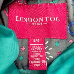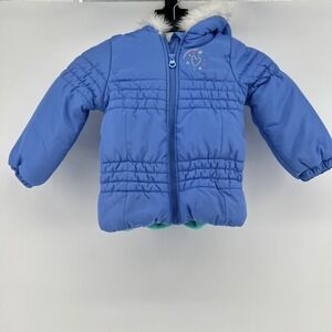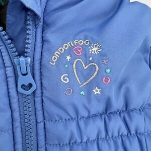 Keywords: London Fog, Kids coat, Puffer jacket, Blue coat, Faux fur hood, Girls outerwear, Winter coat, Size S/4, Embroidered jacket, Childrens clothing, Toddler coat, Quilted coat, Hearts, Snowflakes, Winter fashion