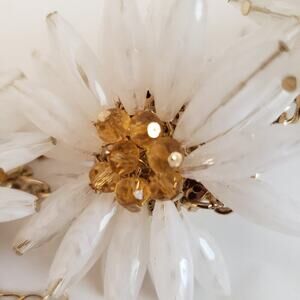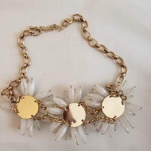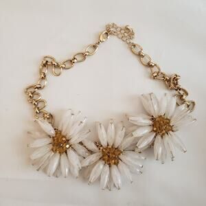 1970s Flower Power Tubular Crystal and Rhinestone Gold Tone Necklace. It features a floral design with gold-tone metal, adorned with crystal and rhinestone embellishments. The style reflects the vibrant, playful aesthetic of the 1970s "Flower Power" era, making it a bold statement piece.