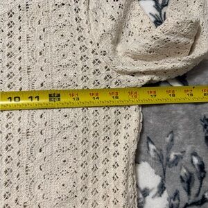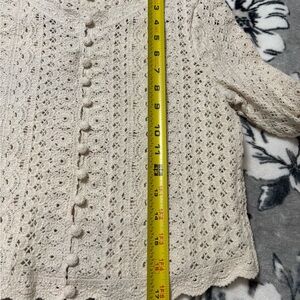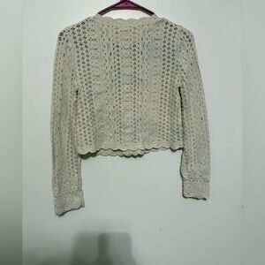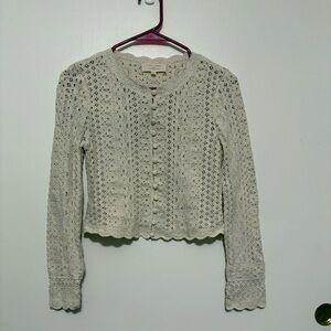 . Sézane Noelie cardigan is a cream-colored crochet sweater featuring delicate buttons and scalloped edges.