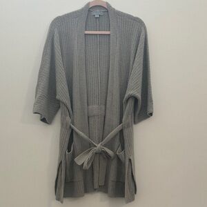 Cozy and stylish cardigan by Barefoot Dreams in a pretty grayish sage green color. Features open front, pockets, and a waist tie detail. Super soft knit! Perfect for layering.