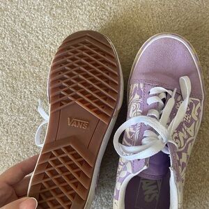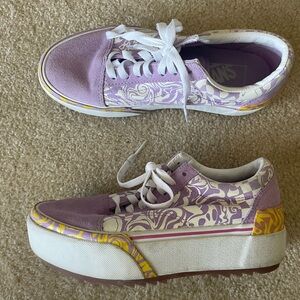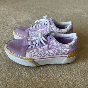 Vibrant purple sneakers with unique patterns. Accented with yellow details. Perfect for a bold look. Very nice preowned condition vans wavy days old school stacked platform shoes. Women’s size 7.