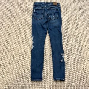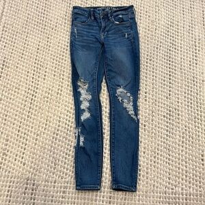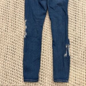 The waist measures 13 inches across, the rise measures 8 inches, and the inseam measures 27.5 inches. They are in very distressed condition. No stains. 71%, cotton 21% viscose 7% polyester 1% elastane.