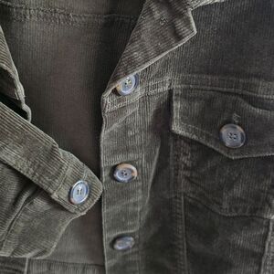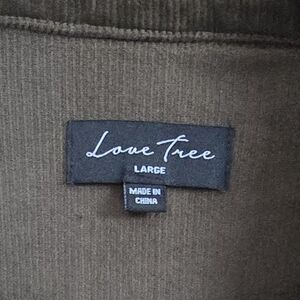 Stylish olive corduroy cropped jacket by Love Tree. Features classic button-up design. Perfect for casual wear.