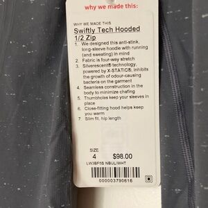 NWT Lululemon swiftly tech put in half zip size 4 I believe the color is called nebula white or something like that. It’s a really nice gray color with little white. Flecks. The first picture is the color-the other ones look darker