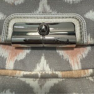 Coach Kristin Op Art Ikat hobo bag in a silver gray print with gold strap and flap closure. Great used condition. Detachable strap has some glue residue. See pictures for wear and measurements.