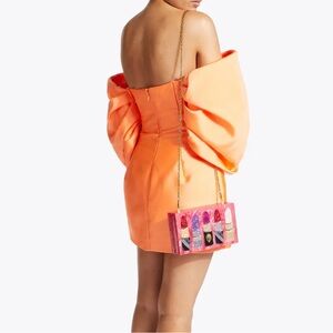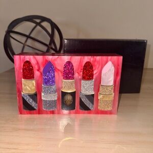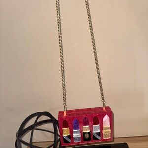Stylish clutch featuring a vibrant lipstick design. Includes a gold chain strap. Perfect for a night out. In almost perfect condition. The “L” is missing on the back of the clutch. This cannot be see while being worn. Other than that that, this clutch is ready to wear.