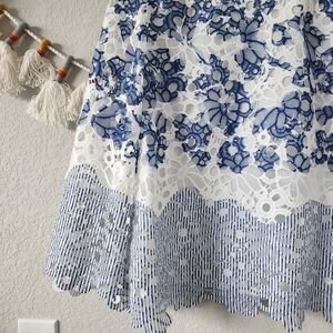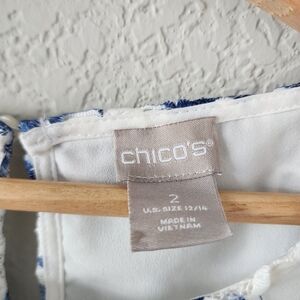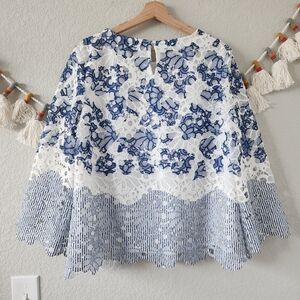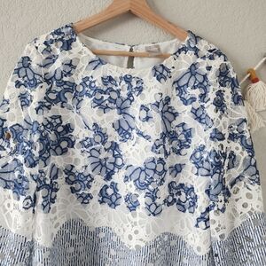 Chico's Floral Blue Printed Lace Top Flare Sleeve Prairie Coastal Modest 12/14