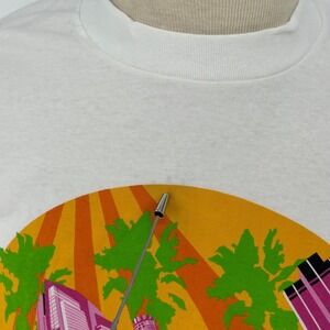 Vintage Lifewear UNITE! t-shirt features a vibrant graphic commemorating the NEA RA LA event held in July 2001. This union-made piece is crafted from a comfortable white cotton blend, showcasing a colorful cityscape with palm trees and a sunset backdrop. The front graphic includes the UAW logo, highlighting its labor-affiliated heritage. A small, faint spot is present near the top of the graphic, as shown in the photos.