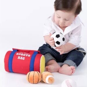 Fun red sports bag with plush basketball, baseball, football, and soccer ball. Great for playtime.