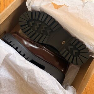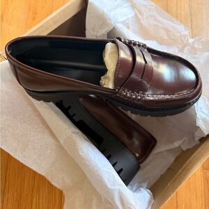 Elegant burgundy loafers. Features a chunky black sole. Perfect for everyday wear. Never worn, adorable. Just too narrow, I have wider feet.