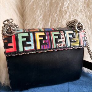 Bold Fendi design with striking multicolor pattern. Features a chunky chain strap. Perfect for adding flair to any look.