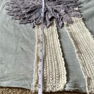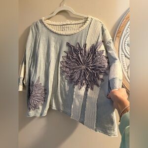 NWOT. Chic blouse with a large purple floral design. Soft blue fabric with cream detailing. Perfect for casual elegance.