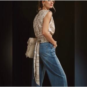 Anthropologie Large Bow Cotton Patterned Sleeveless Wrap Top Beige Cream Large