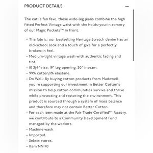The cut: a fan fave, these wide-leg jeans combine the high fitted Perfect Vintage waist with the holds-you-in sorcery of our Magic Pockets™ in front.