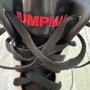 Classic Air Jordan 1 Mid sneakers in white and black with red Jumpman details.