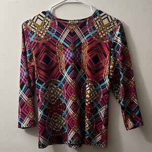 Style Keywords: geometric print top, multicolor blouse, artsy print shirt, boho chic top, retro inspired top, statement pattern, vibrant colors, stretchy knit top, long sleeve blouse, boutique style top