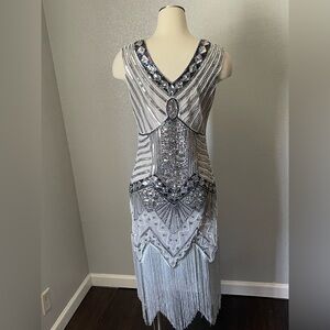 Dazzle at your next event with this stunning sleeveless sheath dress, featuring a V-neckline and intricate silver sequin embellishments. The form-fitting silhouette is perfect for a cocktail party, while the geometric patterns add a touch of vintage elegance. This dress is a showstopper, ideal for making a memorable entrance.
