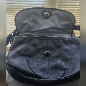 Part of the vintage Coach Legacy collection, it features a distinctive curved flap with silver-tone turn-lock closure.