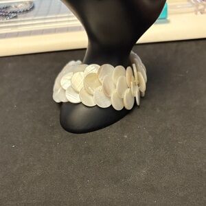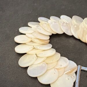 Chic bracelet featuring mother of pearl graduated layered disks in cream and white tones. Perfect for adding a touch of elegance. Older piece but beautiful bracelet.