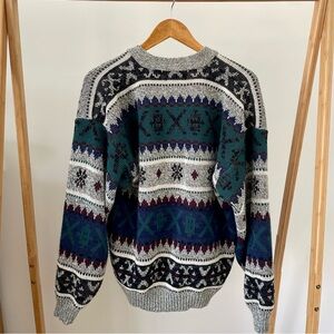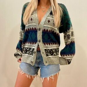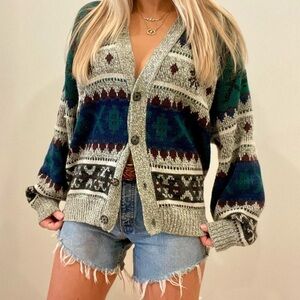 Amazing 90’s patterned cardigan! Men’s size medium modeled on a size small. 100% acrylic. Excellent vintage condition, some normal pilling.