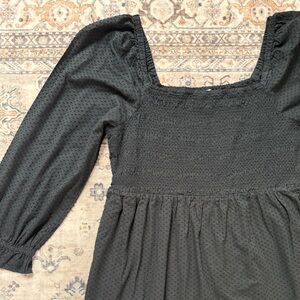 J.Crew dress, black smocked dress, clip dot dress, size large black dress, puff sleeve, square neck dress, textured black dress, LBD, J.Crew factory, modest fashion, romantic aesthetic, spring dress, sun dress, tiered black dress, Cottagecore, Nap Dress style, Regencycore, Dark Romance, Victorian-inspired, Prairie, Smocked Bodice, Square Neck, Balloon Sleeve, Tiered Skirt, Midi Dress, Little Black Dress, LBD, Clip Dot, Textured, Breathable, Summer Goth, Romantic, Feminine, Whimsical, Wedding Guest, Date Night, Brunch Dress, Modest, Minimalist, Classic