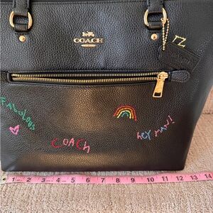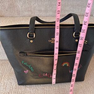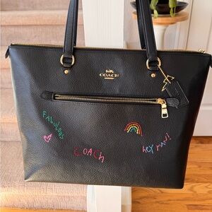Chic black leather tote by Coach. Features vibrant diary embroidery details. Perfect for daily essentials Purchased new and used one time. In great condition. Cleaning out my closet is your gain! Great work bag, fits a 14 inch laptop.
