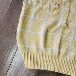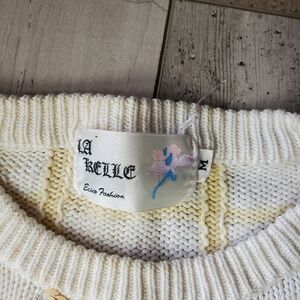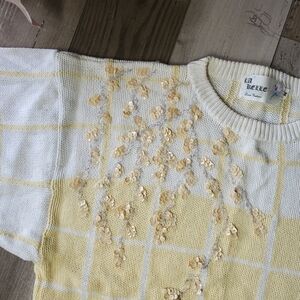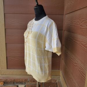 La Relle Women's Yellow and White Short Sleeve Embellished Vintage Sweater MED