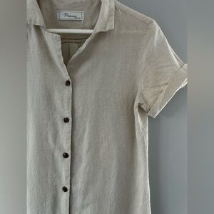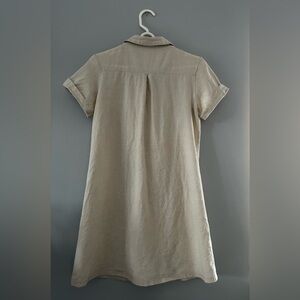 Size S. No material tag but feels like a linen-cotton blend in an unbleached natural colour. Button front. Cuffed short sleeves. Dart in back. Midi length. Gently worn — no damage. Shoulders 14.75” P2P 18” Sleeves 6.5” Waist 17.25” Hips 20” Back length 33”