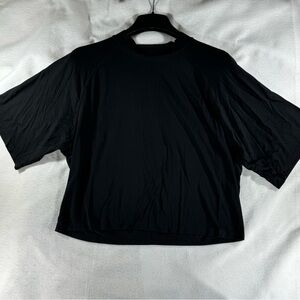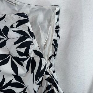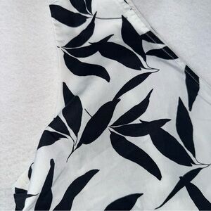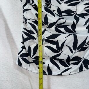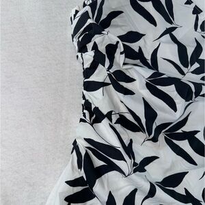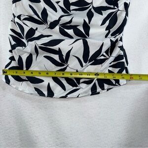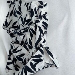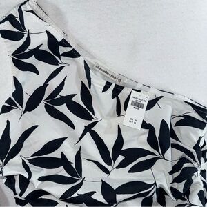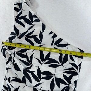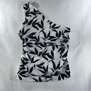 Chic one-shoulder top with bold black leaf design on white. New with tags! Ruching sides to contour that waist. Small slit on the both sides wt the bottom. Zipper opening on the one side. So many ways to style this new top.