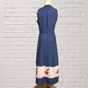 Adorable vintage Park East by Swirl sleeveless midi dress from the late 1970s. Made in the USA from a soft cotton-poly chambray blend with eyelet lace trim and red apple appliqués. Features a fitted bodice, gathered waist, and back zip closure for a flattering cottagecore silhouette.