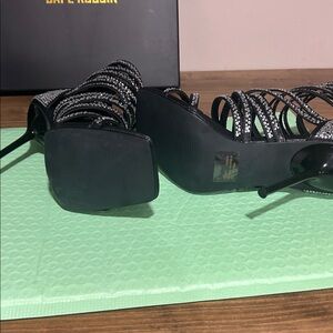 Step out in style with these elegant black strappy heels adorned with sparkling rhinestones. Perfect for any special occasion. They are new in box, never worn. Size 7. Comes with replacement heel stoppers. About a 4 inch heel.