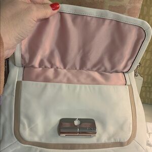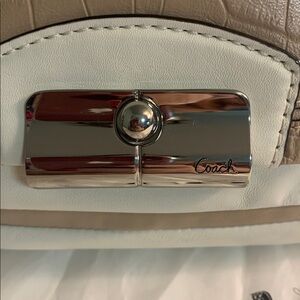 Elegant white & tan bag with Coach logo on silver hardware. Front pocket. Zipper Top.